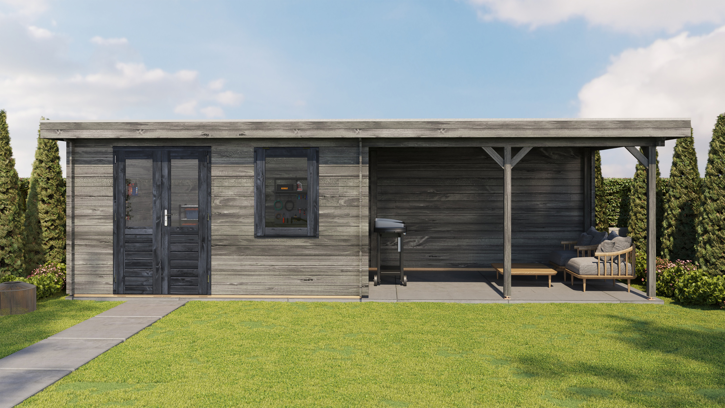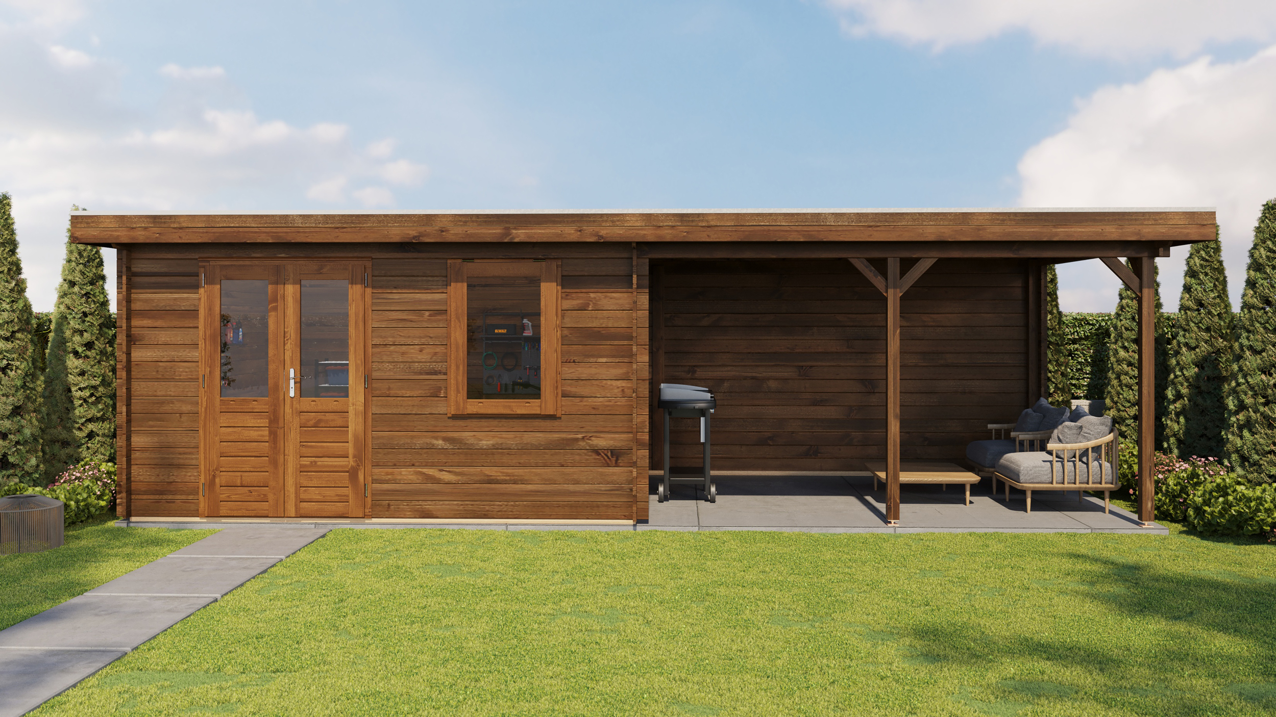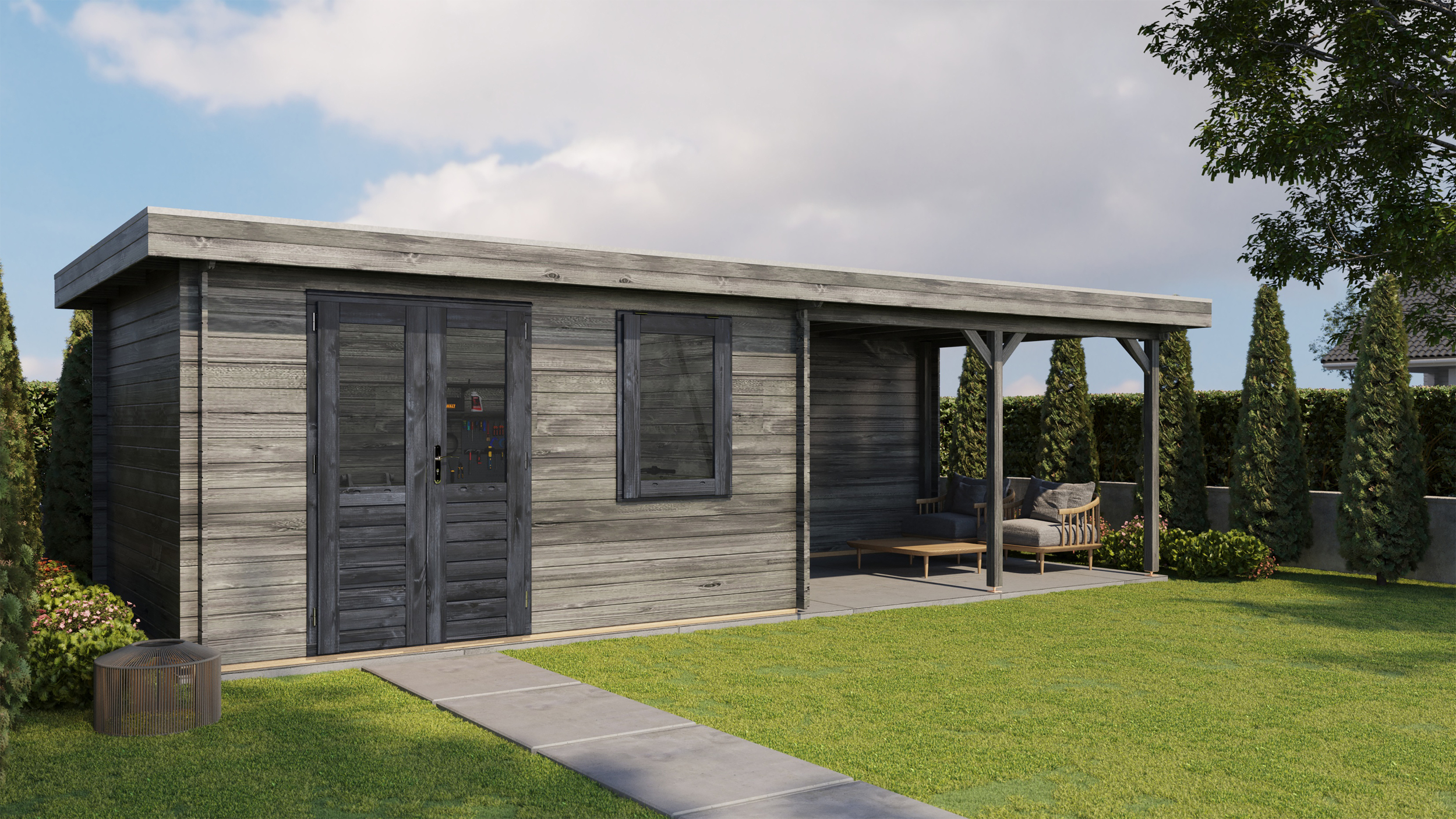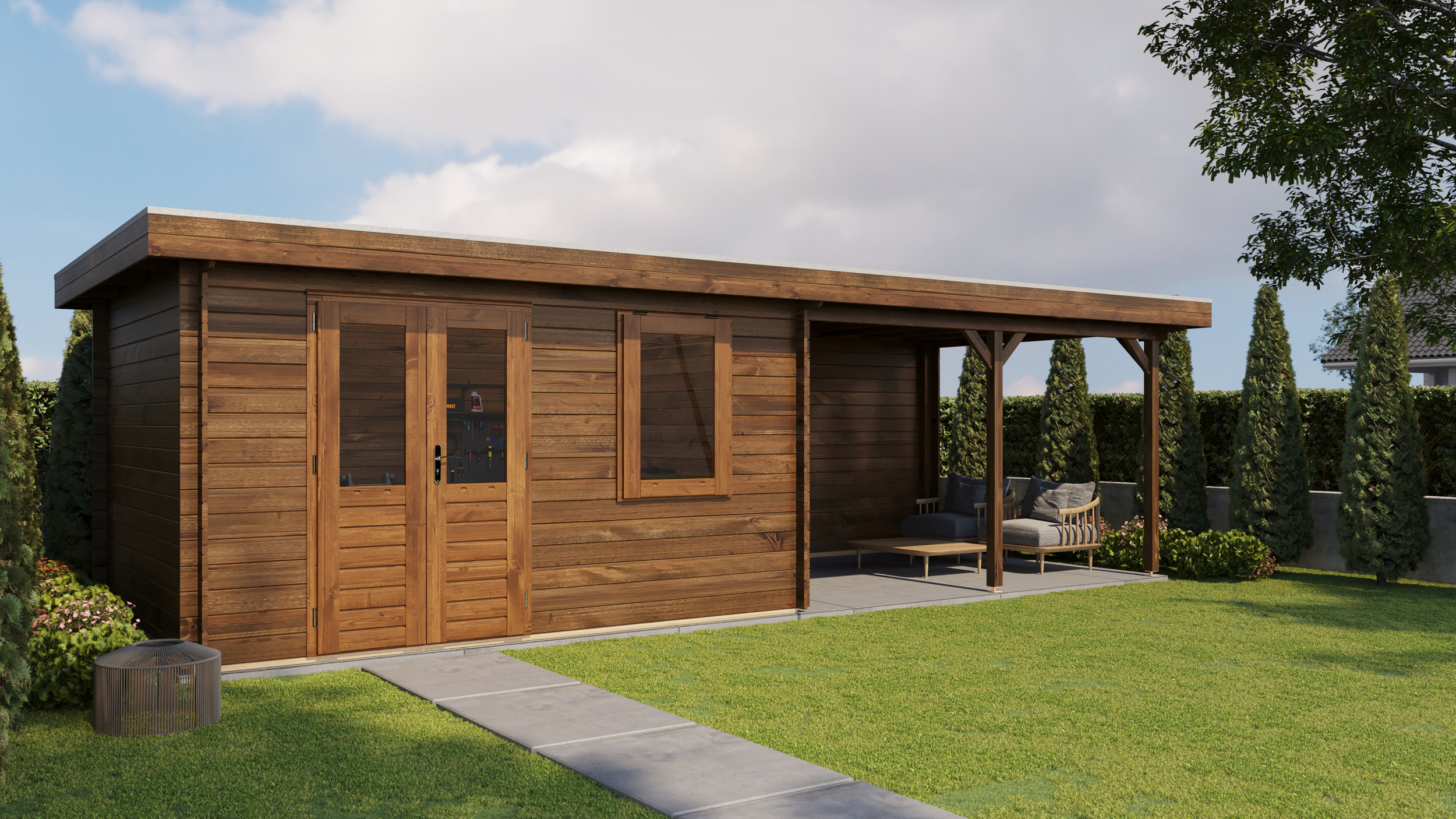 Classic Log Cabin with Veranda - Flat Roof - 28mm thick walls