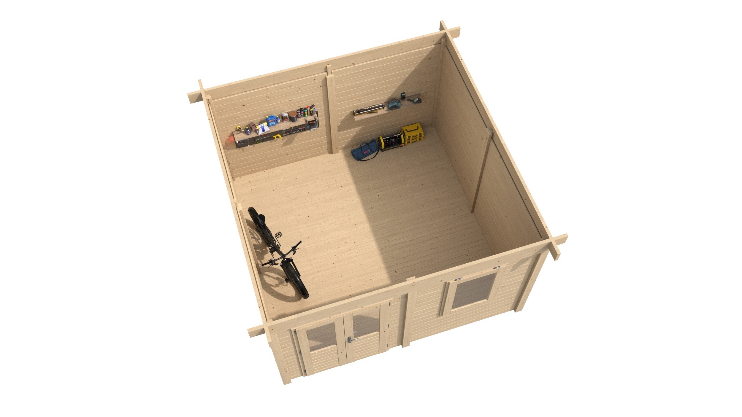 Building is supplied with a Glu-Lam, warp free, double door set as pictured, measuring 193cm x 121cm, and a matching top hung window measuring 114cm x 77cm.