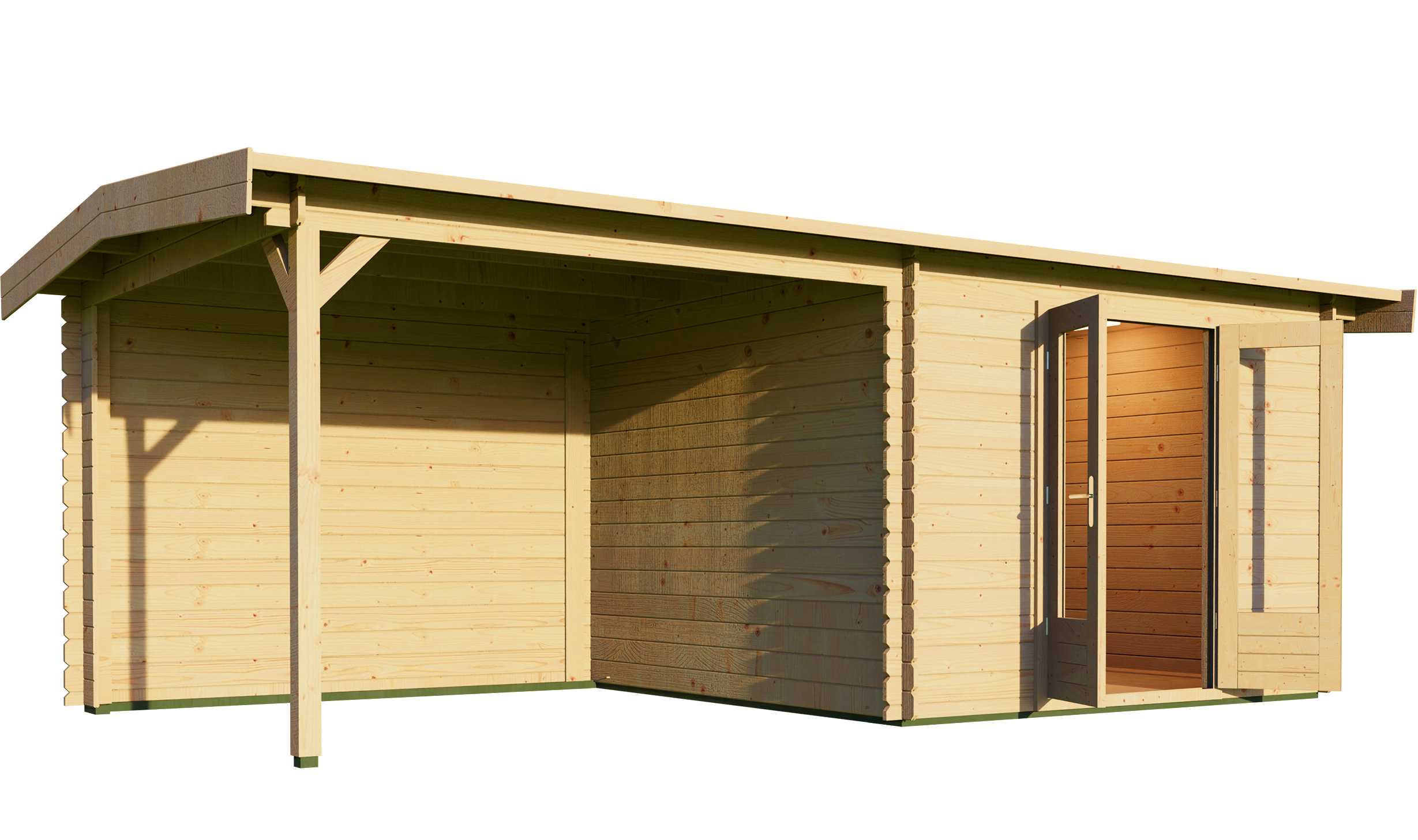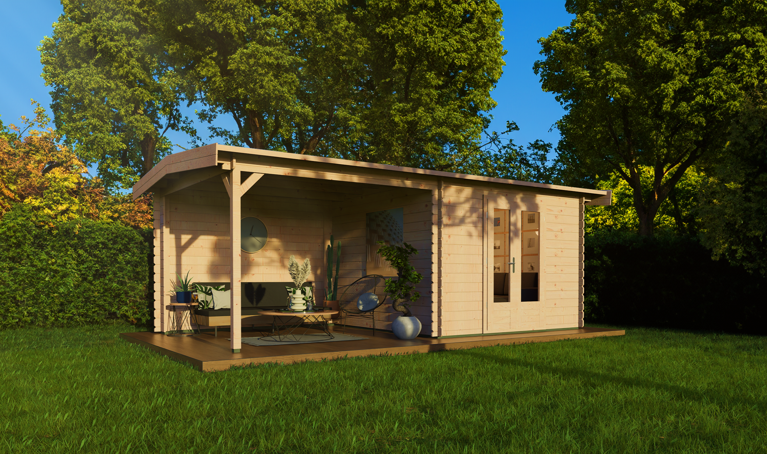 Log cabin 300x300cm + 300cm Veranda - Apex roof - 28mm thick walls - 1st class kiln dry spruce - 18mm T&G Roof boards - Double glazing - Door with laminated 4,5cm thick wood - incl. 18mm T&G flooring - pressure treated foundation beams included - All hardware included