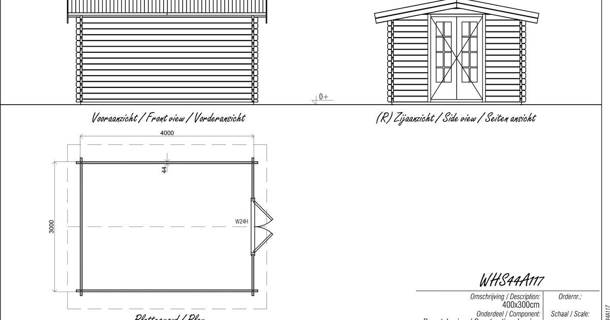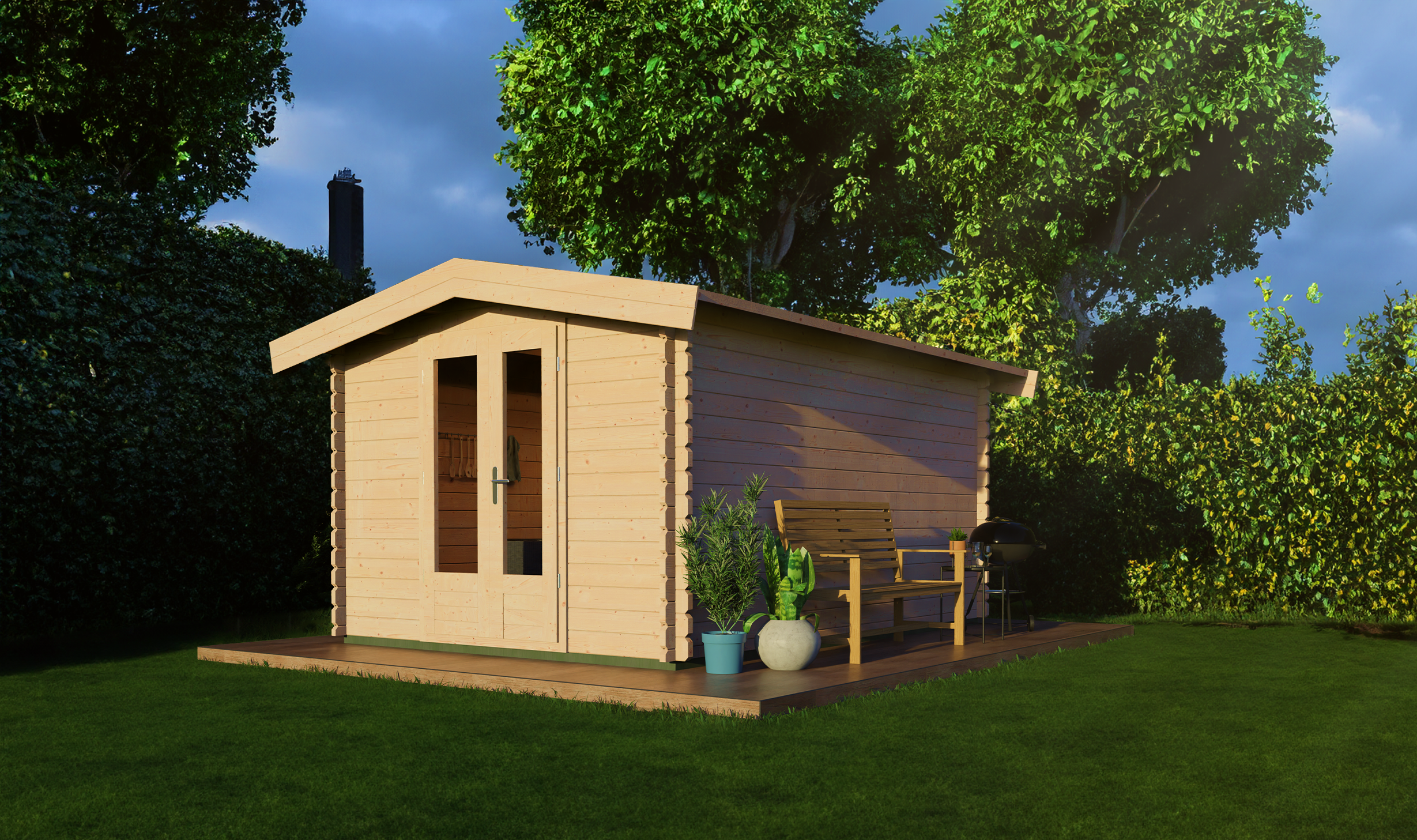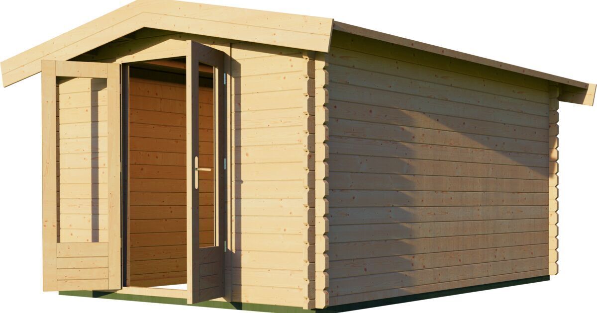 Log cabin 300x400cm - Apex roof - 44mm - 1st class kiln dry spruce - 18mm T&G Roof boards - Double glazing - Door with laminated 4,5cm thick wood - incl. 18mm T&G flooring - pressure treated foundation beams included - All hardware included