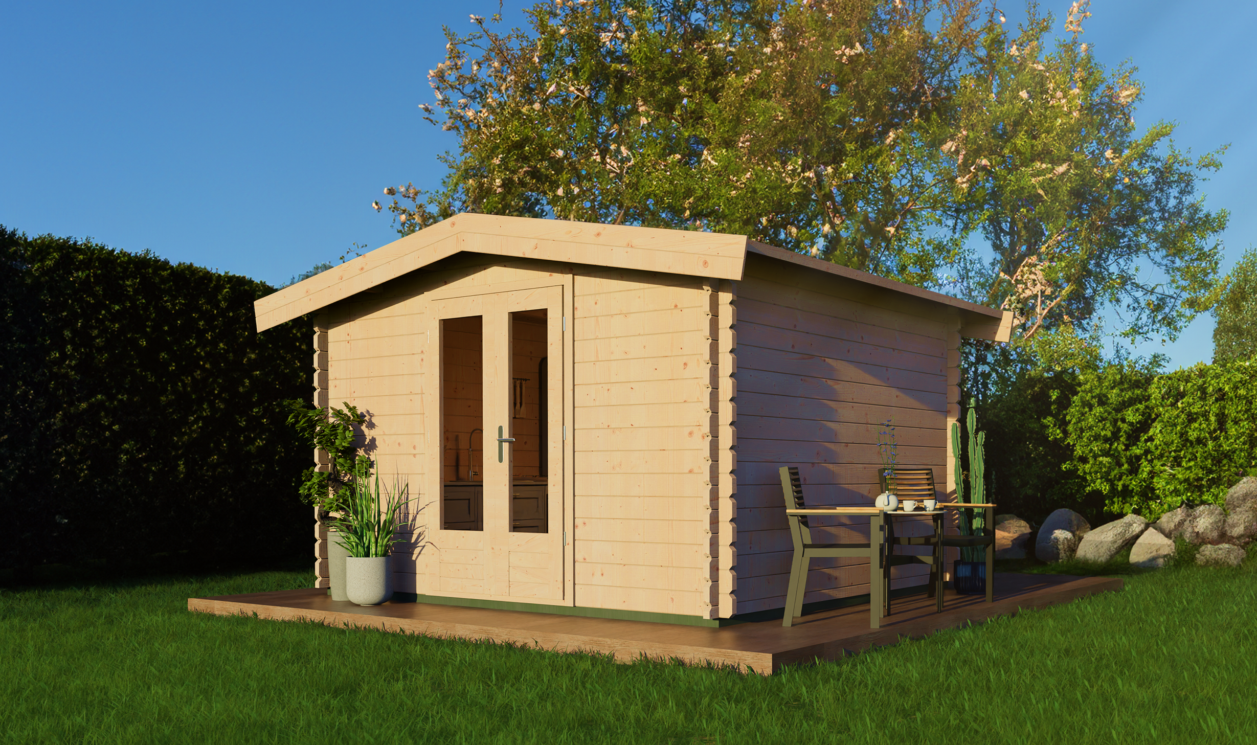 Log cabin 350x300cm - Apex roof - 44mm - 1st class kiln dry spruce - 18mm T&G Roof boards - Double glazing - Door with laminated 4,5cm thick wood - incl. 18mm T&G flooring - pressure treated foundation beams included - All hardware included